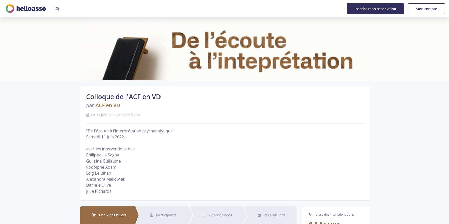 La gestions des inscriptions est effectuée via HelloAsso. Cette plateforme permet la personnalisation de la page de l’évènement à travers la mise en ligne d’une bannière et d’une miniature. J’ai également réalisé ces deux ressources graphiques supplémentaires.
