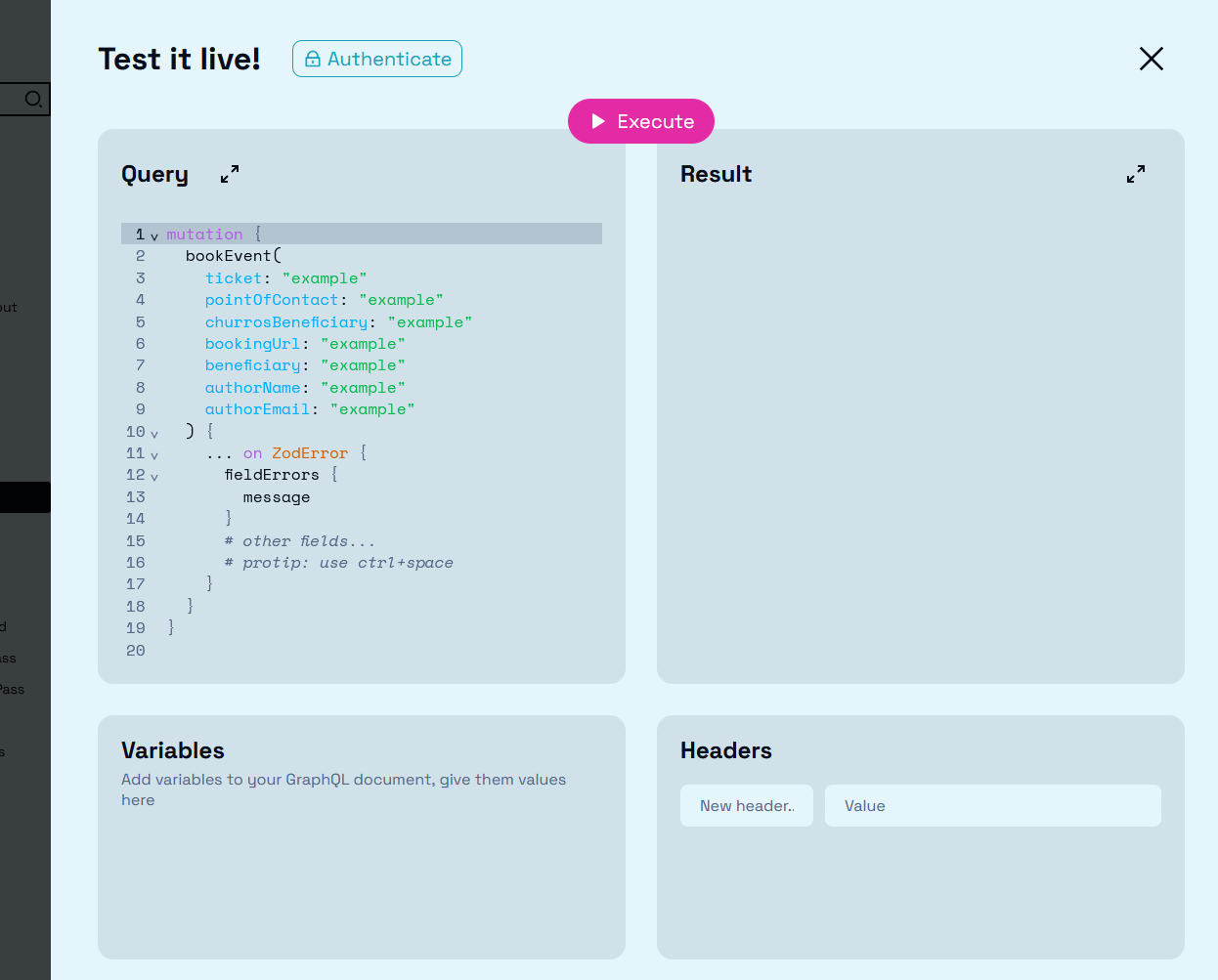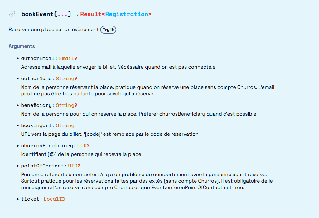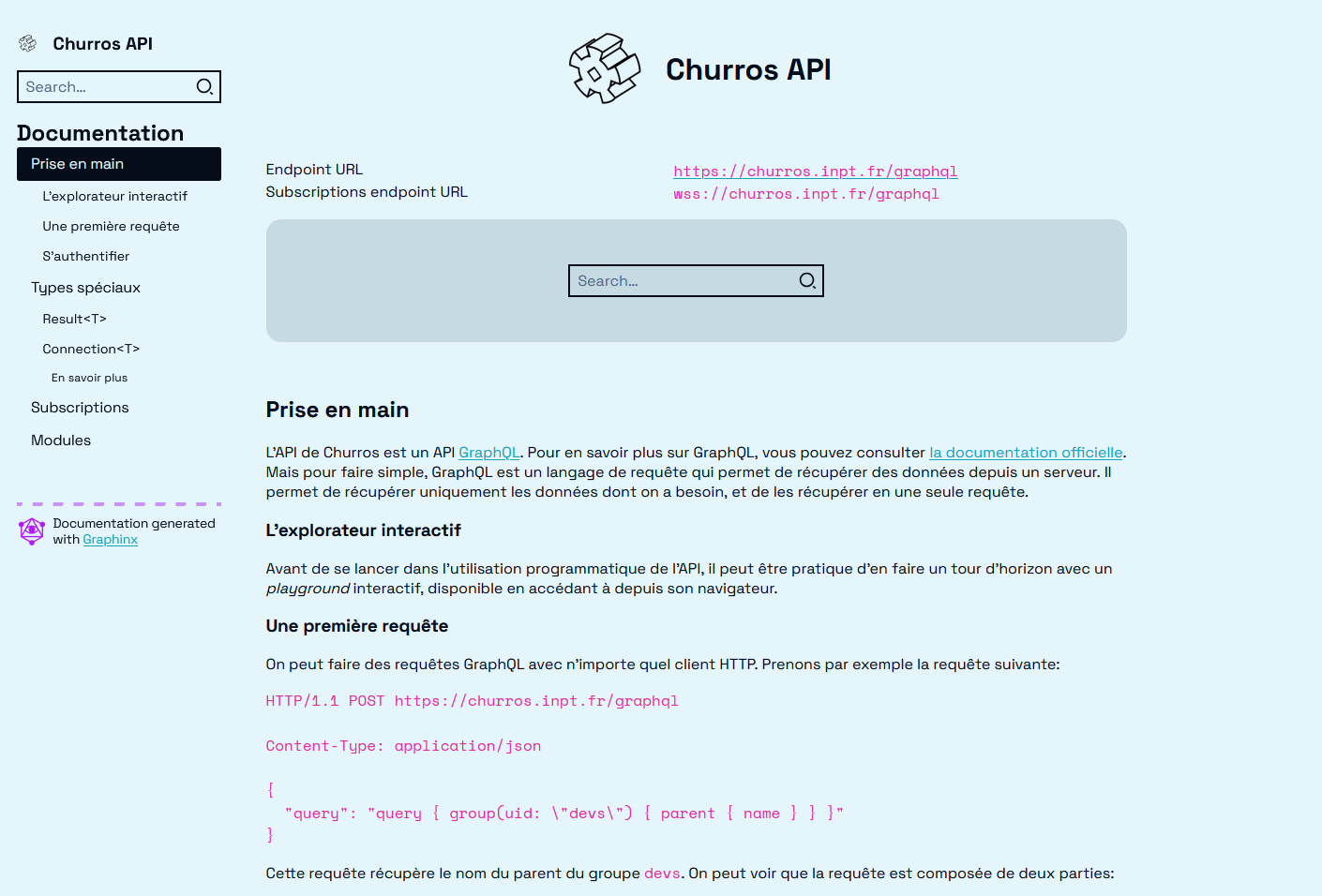GraphQL étant moins populaire, j’ai développé, parallèlement à Churros, un système de génération de site de documentation interactif, Graphinx, qui a donc pu servir à documenter l’API de Churros: