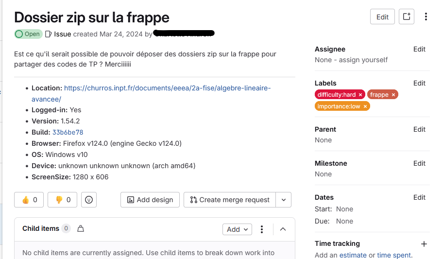 Un signalement devient une issue sur Gitlab, l’endroit où l’on développe. Passer d’une demande utilisateur au développement est donc naturel et sans efforts.