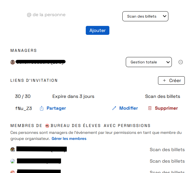 Les managers d’un évènement peuvent être rajoutés via un lien d’invitation, on en ayant un certain rôle (président·e, etc) au sein du groupe (club ou association) qui organise l’évènement en question.