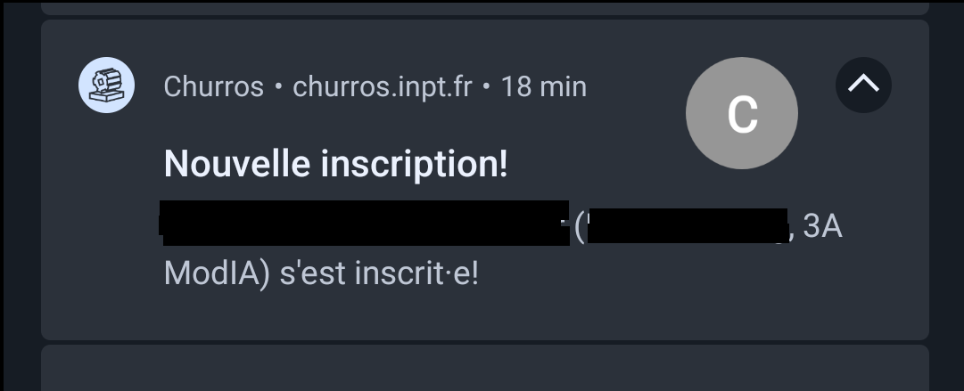 Une notification destinée aux admins, annonçant une nouvelle inscription (désactivée pendant la rentrée)