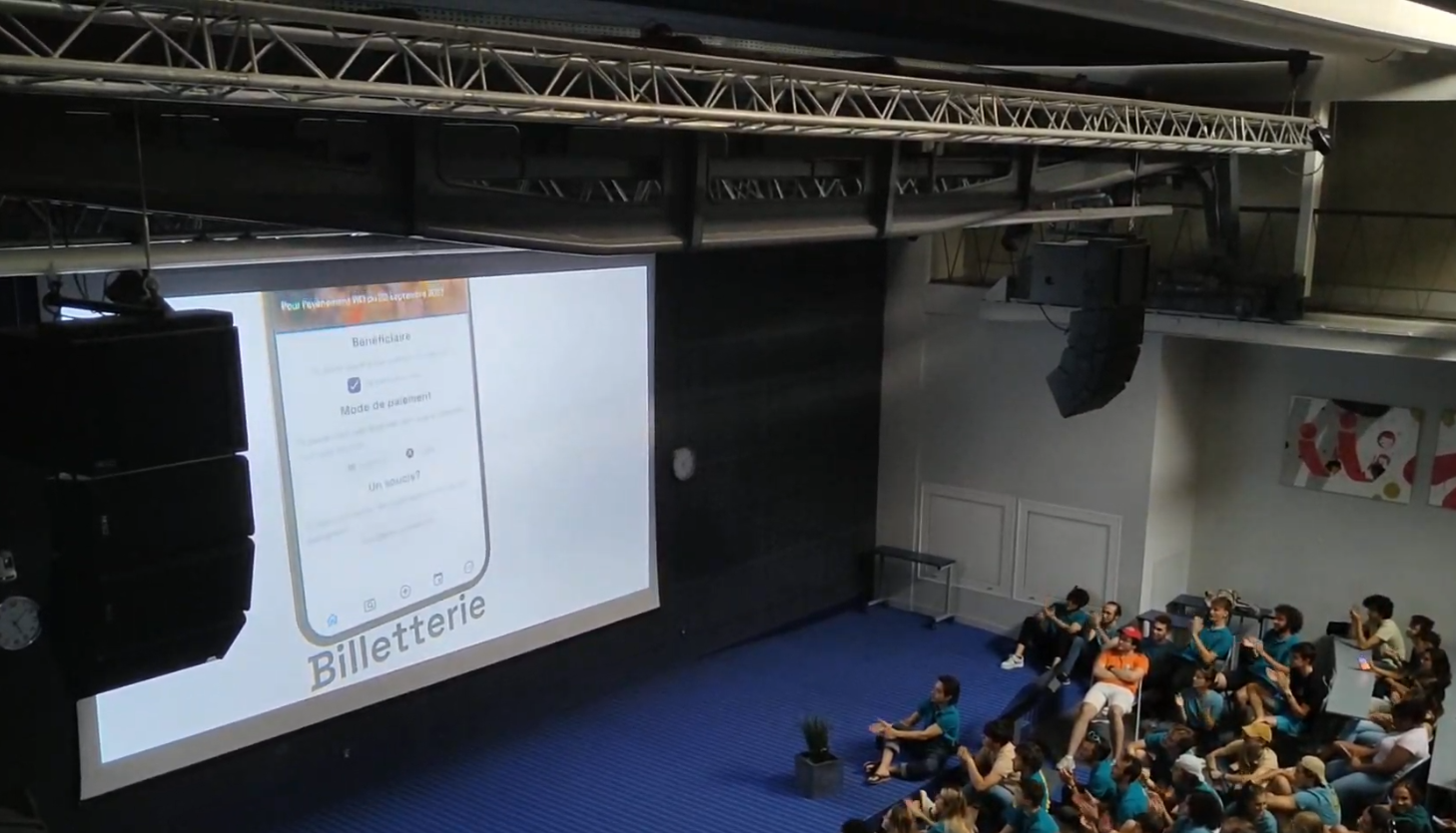 Diffusion d'une vidéo annonçant l'appli dans le grand amphithéâtre de l'école, réalisée par l'asso vidéo étudiante, TVn7
