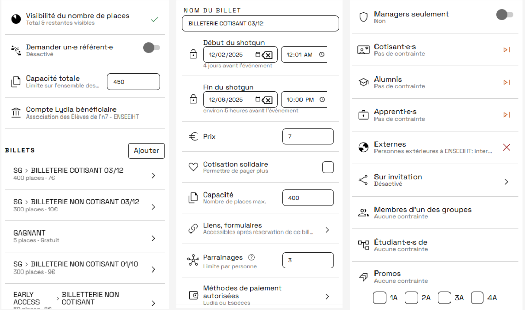 Réglages possible sur la billetterie d'un évènement