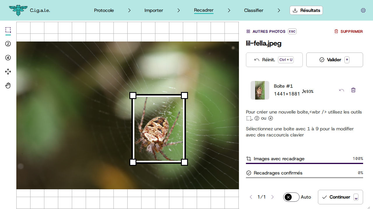 L’idée est de proposer une application où l’on peut, à l’issue d’un transect1, déposer ses photos, laisser un réseau neuronal détecter un ou plusieurs insectes dans chaque image afin de les recadrer, corriger et vérifier ces recadrages, puis les classifier, notamment en identifiant l’espèce de l’insecte, là aussi avec de l’assistance à la classification par un réseau neuronal.