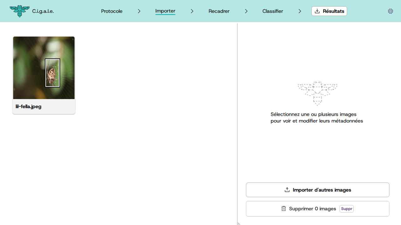 Le projet été donc de proposer une solution tout-en-un, qui va de la carte SD de l’appareil photo, jusqu’aux images recadrées et annotées. De plus, l’application est une webapp, et ne nécéssite donc aucune installation. Grâce à diverses technologies modernes des plateformes web, souvent regroupées sous la bannière des PWA (Progressive Web Apps), l’application est disponible hors ligne après la première utilisation, et effectue toute inférence par réseau neuronal sur l’appareil, ce qui améliore la performance (pas besoin d’envoyer les images sur un serveur distant), la confidentialité et la facilité de déploiement.